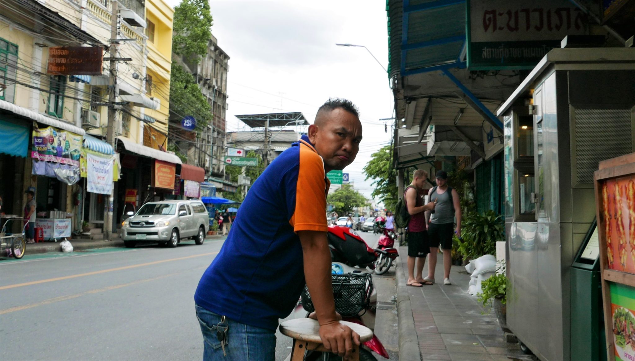 I to był punkt zapalny. Nieoczekiwanie Taj stał się agresywny! Gwałtownie wstał i ruszył w moją stronę z rękami w gotowości do walki! Ha! Wyobrażasz sobie? Emil był obok i od razu zareagował głosem jak i swoją postawą, więc Taj cofnął się. Ale emocje mu puściły i totalnie wkurwiony zaczął odganiać nas od swojego wózka. A to wzbudziło zainteresowanie jego znajomych ze stoisk na tej samej ulicy. Wszyscy zaczęli na nas patrzeć, część podeszła bliżej i obserwowała rozwój wydarzeń. Oczywiście, to na mnie i Emila patrzono jak na wrogów narodu.