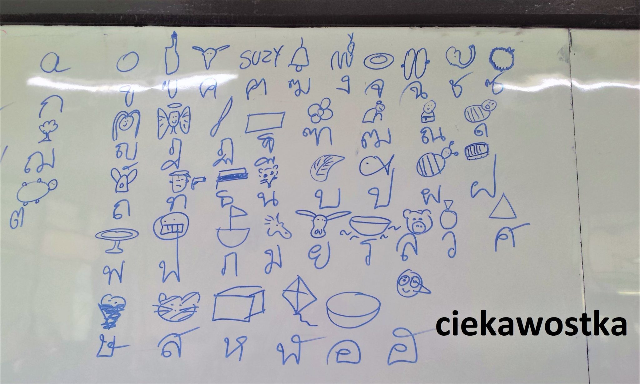 Tajski alfabet też jest fajny. Moi uczniowie próbowali mnie nauczyć o swoim języku jak najwięcej. Tak teżp wiem, że podstawowy alfabet ma 54 litery. Każda litera to jakby jedno słowo, które można zobrazować rysunkiem. Jasne? Nie bardzo. O, tutaj zdjęcie z jednej z moich lekcji, gdy dzieci napisały mi wszystkie litery alfabetu, a następnie próbowały opisać po angielsku jaki obraz za tym stoi, a ja musiałam narysować: