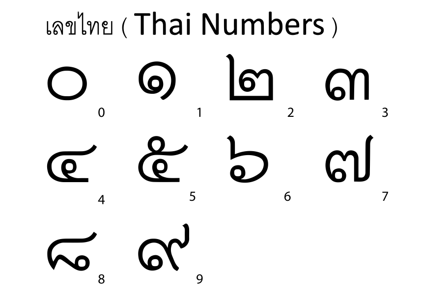 Czy wiecie, że Tajowie mają też własne cyfry? Powszechnie używa się tych arabskich, a tajskie stosuje jedynie w państwowych dokumentach czy instytucjach i czasem tam, gdzie dużo turystów, coby zapisać podwójne ceny. Przeciętny Farang się nie zorientuje, a Taj zapłaci mniej. Ale Wy jesteście niezwykli, bo czytacie mojego bloga, a ja w Tajlandii mieszkałam, więc takimi smaczkami się dzielę jedynie z Wami. Więc proszę bardzo, oto tajskie liczby: