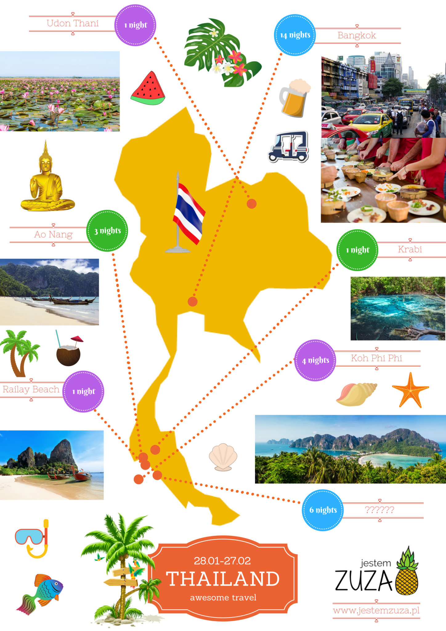 Planujesz wyjazd do Tajlandii? Szukasz inspiracji? Zastanawiasz się co warto zobaczyć? Tadaaaa! Przed Tobą plan podróży, który ułożyłam dla siebie, a że mieszkałam w Bangkoku dwa lata, to myślę, że jest naprawdę spoko. Bangkok, Udon Thani, Krabi, Ao Nang, Koh Phi Phi, Railay Beach.