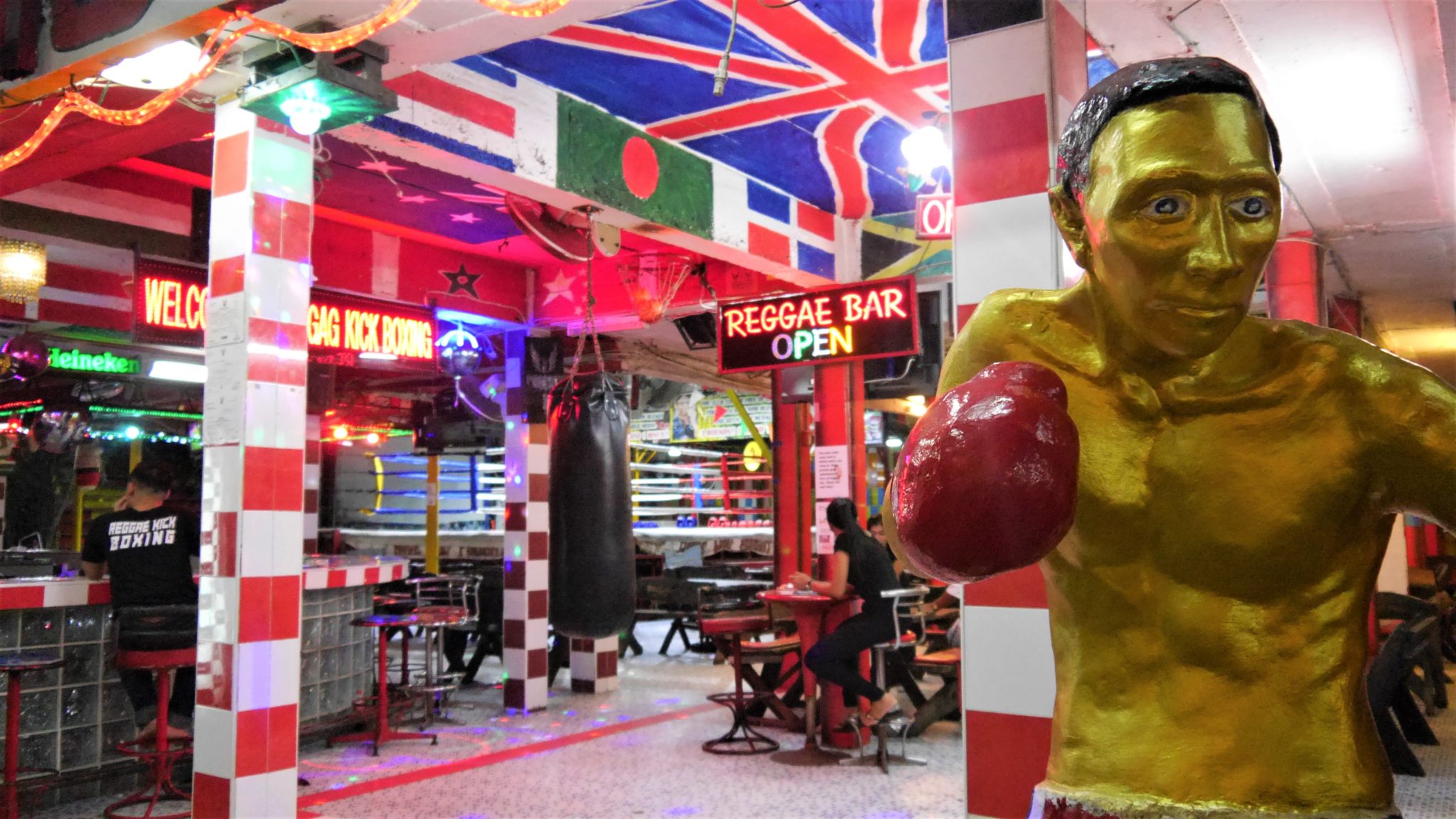 Tak, to jest Reggae Bar w którym znajduje się stadion muay thai. Ale to nie koniec! Na scenie, prócz prawdziwych zawodników, walczą osoby z publiczności. Haha. Serio! Nie ściemniam! Sama prawie dałam się sprowokować… Dostajesz ochraniacze i jechane! Jeżeli wytrzymasz 3 pełne rundy, w nagrodę dostajesz darmowe wiaderko wódki. Biznes jak ta lala!