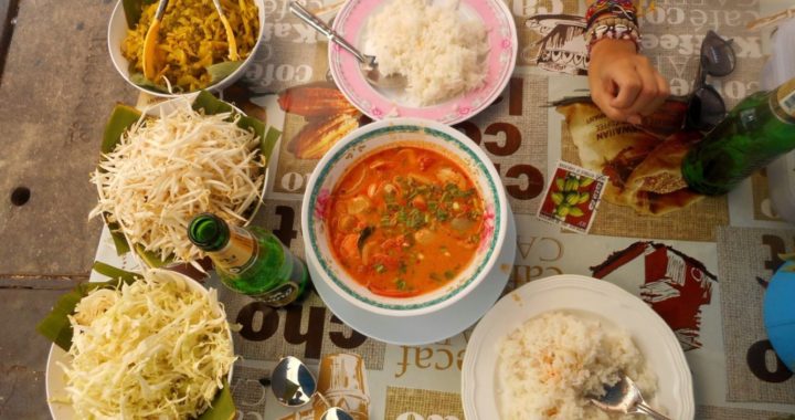 Możesz jeść oporowo tanio, jeżeli wiesz gdzie szukać. Wystarczy zejść z głównego szlaku turystycznego i chwilę pobłąkać się po bocznych uliczkach. Najtaniej w Tajlandii zjedliśmy w Hua Hin. Było to stoisko obok domu jednej z tajskich rodzin. Mama gotowała i nakładała duże porcje dla przechodzących zaintersowanych. Tata dowoził ciepłe jedzenie skuterem pod wskazany adres. Dwójka białych ludzi wywołała tam niemałe poruszenie. Usiedliśmy przy krzywy, plastikowym i różowym stoliku zaraz obok domu gotującego małżeństwa. Za dwie ogromne porcje smażonego ryżu z kurczakiem i warzywami zapłaciliśmy 7zł. Meeeeega, coooo?