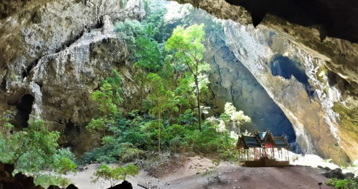 Sam Roi Yot oznacza górę trzystu szczytów. Rzeczywiście krajobraz był górzysty. Moje ulubione smocze skały dominowały widoki. Natomiast sama jaskinia, to jakiś cud natury. Składa się z dwóch przedsionków. W obu sklepienie zawaliło się tworząc otwór przez które wpadają promienie słoneczne oraz deszcz. Dzięki temu pod ziemią, ku słońcu, pną się bujne krzewy, drzewa i kwiaty. W drugim, większym przedsionku stoi także czerwono-złoty domek, który został wybudowany na życzenie Króla Ramy V.