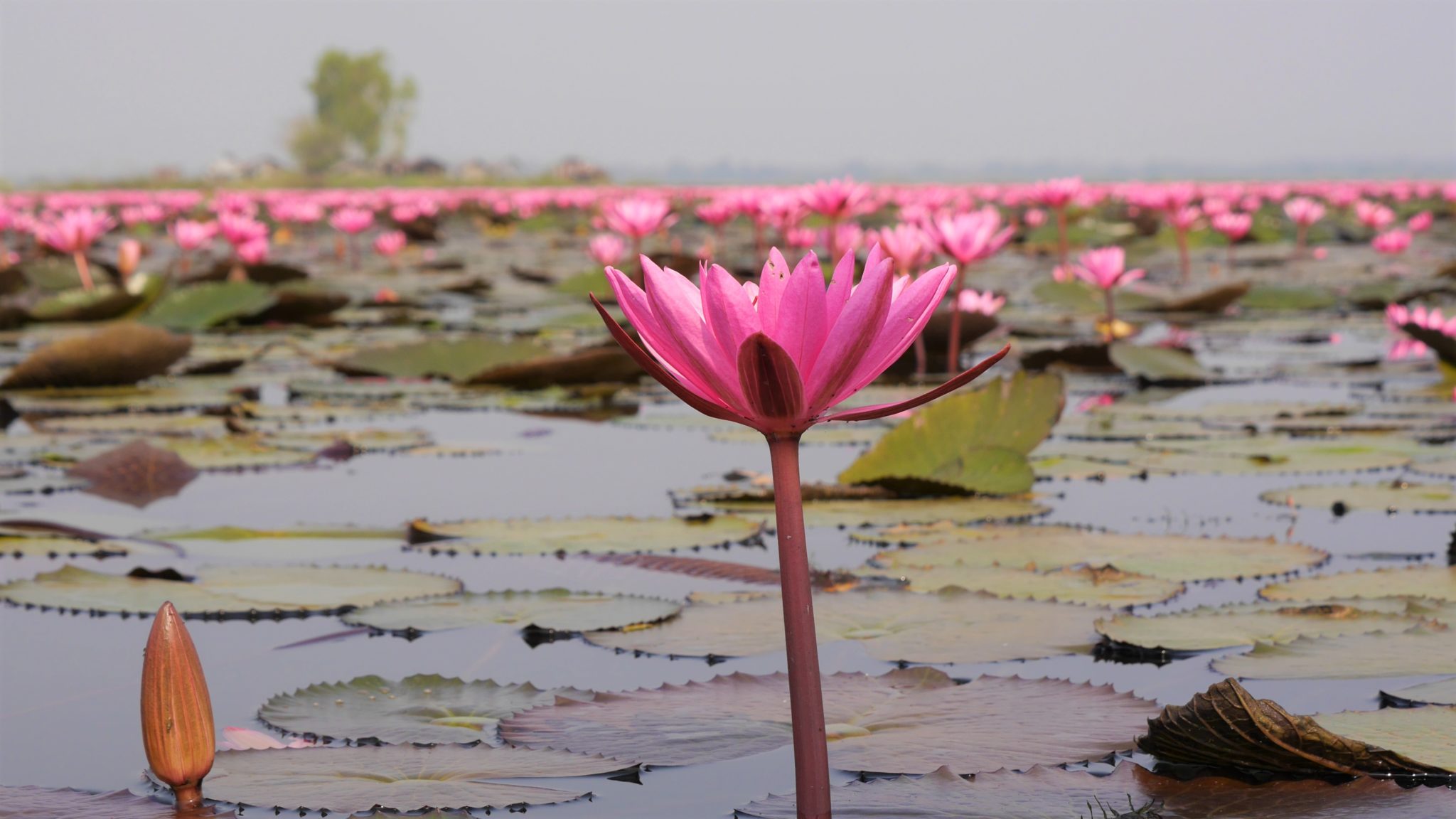 Ja to piękne miejsce odkryłam przypadkiem. Przeglądałam anglojęzyczne strony o Tajlandii. Jak tylko zobaczyłam zdjęcia jeziora pełnego różowych kwiatów…. Wiedziałam, że tam pojadę. Chociaż szczerze mówiąc, byłam sceptycznie nastawiona. Byłam przekonana, że zdjęcia w internecie są podrasowane, podkolorowane i nie przedstawiają prawdziwego jeziora. Wiadomo jak to jest z fotami z atrakcji turystycznych. Naoglądasz się google grafika, potem jedziesz na miejsce i jest zonk. Myślałam, że tym razem będzie tak samo, ale jak to ja – nie uwierzę póki nie sprawdzę. Specjalnie kupiłam samolot z miesiąc wcześniej, w Udon Thani zaplanowałam tylko jedną noc. Tak naprawdę pojechałam na północ Tajlandii specjalnie nad to kwieciste jezioro….