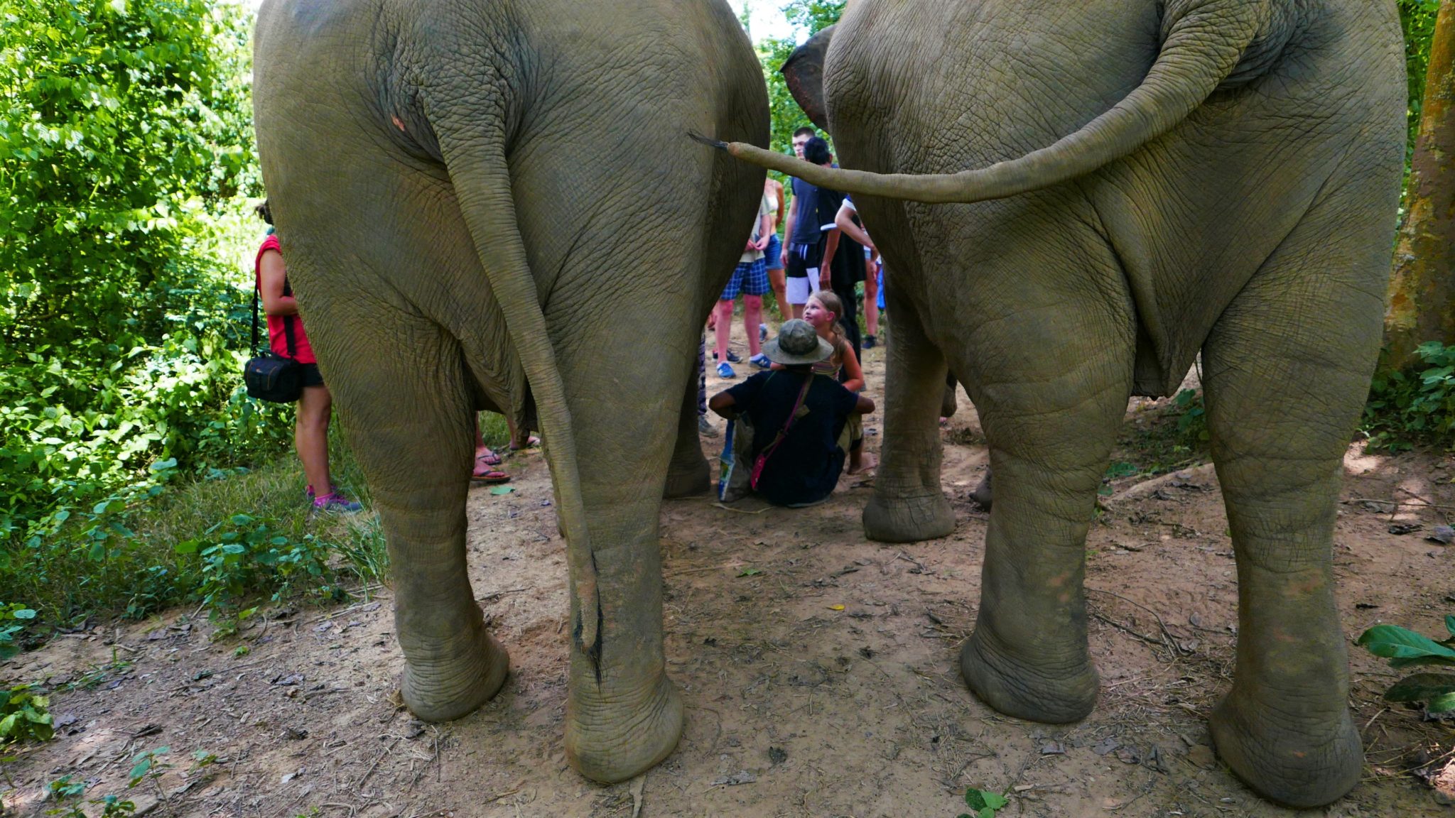 Takie mieliśmy wrażenie w trakcie wizyty w Elephant Haven. Grzejące słońce, zwierzęta bez łańcuchów, luzem chodzą pomiędzy ludźmi. Gdy spacerowaliśmy w dżungli, słonie łaziły pomiędzy nami jak chciały. Czasem z tyłu zaczepiały trąbami, czasem zbaczały ze ścieżki i wchodziły w gęsty las. Niejednokrotnie oddzielały się od nas i spędzały czas nad brzegiem rzeki, w cieniu lub drapiąc się o jakąś super gałąź. Zwierzęta nie są do niczego zmuszane, przewodnicy nie gonią ich by szły z grupą czy by weszły do wody nawet gdy nie mają ochoty. Słonie robią sobie co im się żywnie podoba 😀