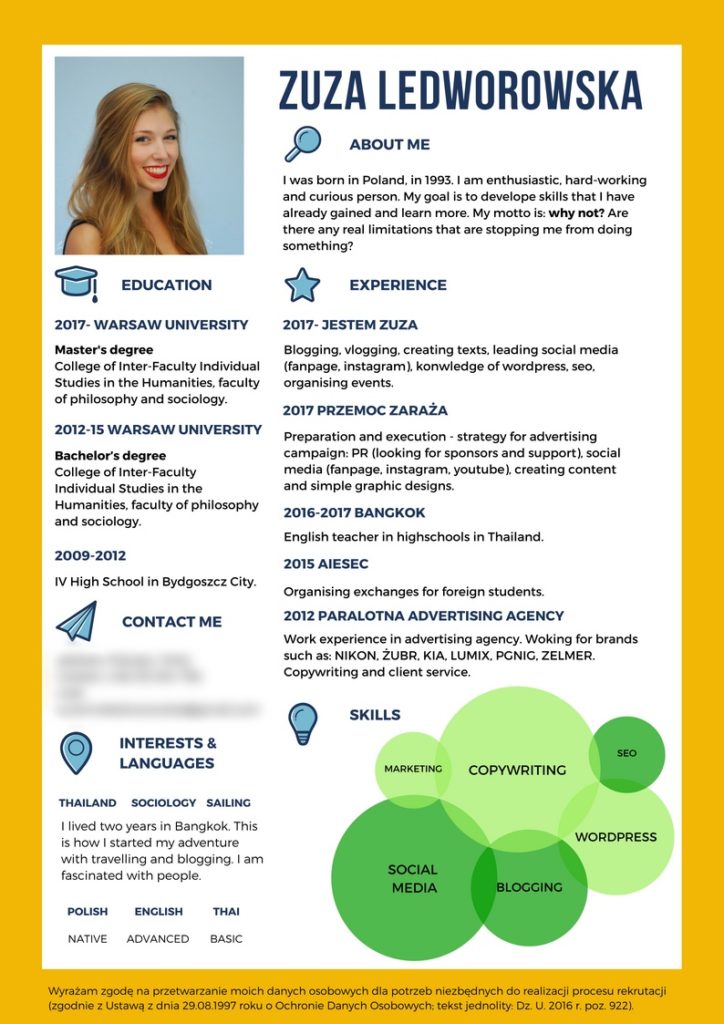 Cholera, w Canvie jest ileś set darmowych szablonów! Nawet talentu graficznego mieć nie musisz. Wystarczy przepisać info z nudngo wordowskiego CV do szablonu. Więc nawet mnie nie denerwujcie! Jeden wieczór i gotowe.