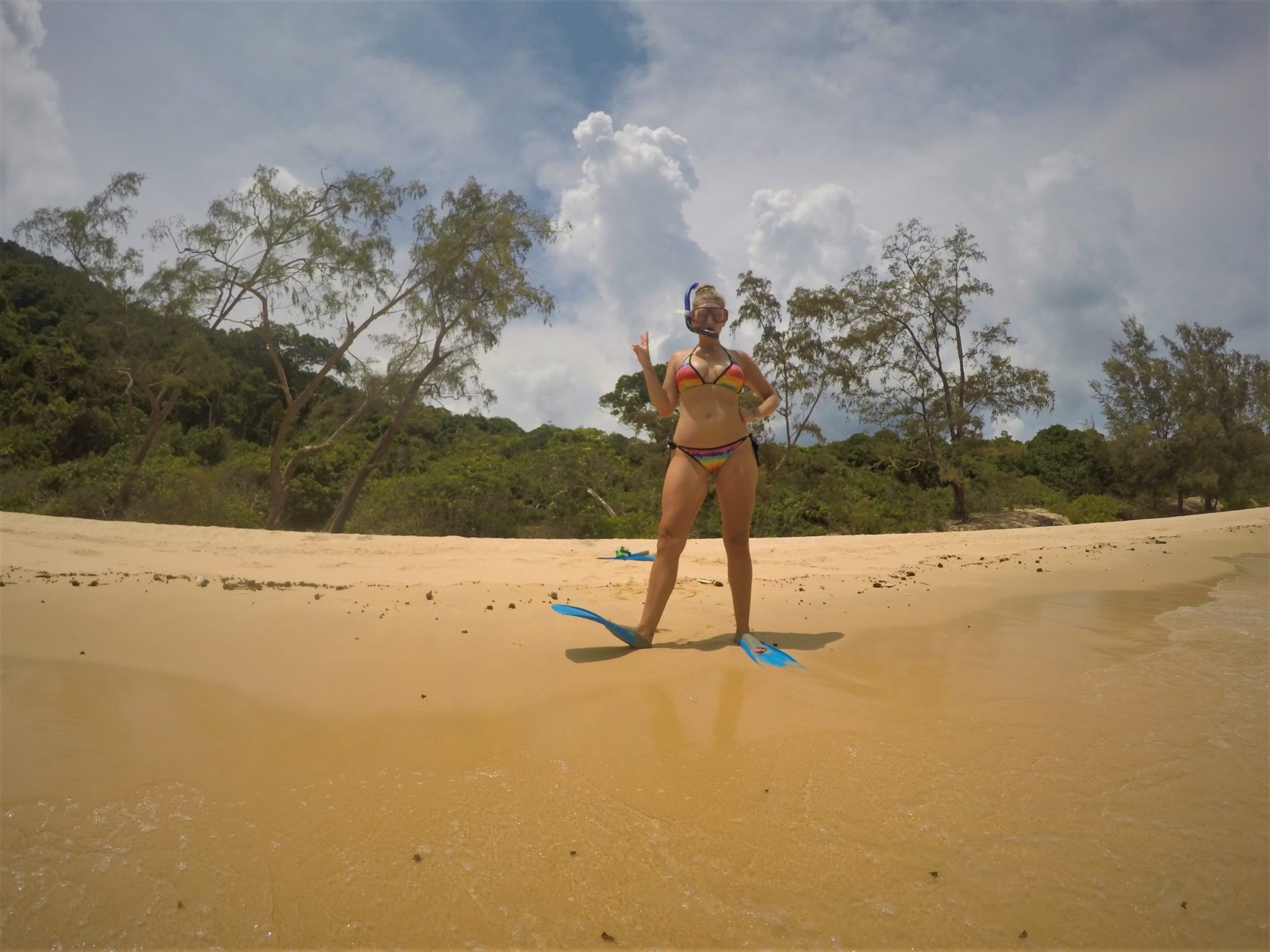 Bieganie po plaży na wyspie było moją ulubioną częścią dnia. Biegniemy nie śpiesznie, na boso, po białym piasku, czasem rozchlapując przejrzystą wodę. Wtedy oddychamy pełną piersią, a niebo wydaje się tak pięknie niebieskie, a baranki z chmur tak interesujące… Słońce parzy w ramiona, pot zalewa oczy… Gdy przebiegniemy całą plaże i pozdrowimy wszystkich coraz bardziej znajomych, wchodzimy do oceanu i czilujemy w chłodnej wodzie. Cudownie. Bliskość natury z jednej strony fascynowała, z drugiej przerażała. Czasem w nocy, gdy leżeliśmy w ciemności, słuchaliśmy odgłosów dżungli, zastanawiając się co czai się w gałęziach drzew. Zdarzało się, że te dzikie wrzaski zagłuszała potężna burza. Silny wiatr gnący drzewa, wzburzony ocean zmywający brzeg i monsunowy deszcz, któremu nie oparł się żaden dach. Gdy uderzały grzmoty, wszystko trzęsło się w tańcu przerażenia. Jedynie spektakl błyskawic był warty zobaczenia. Przytłaczająca, ale zachwycająca natura.